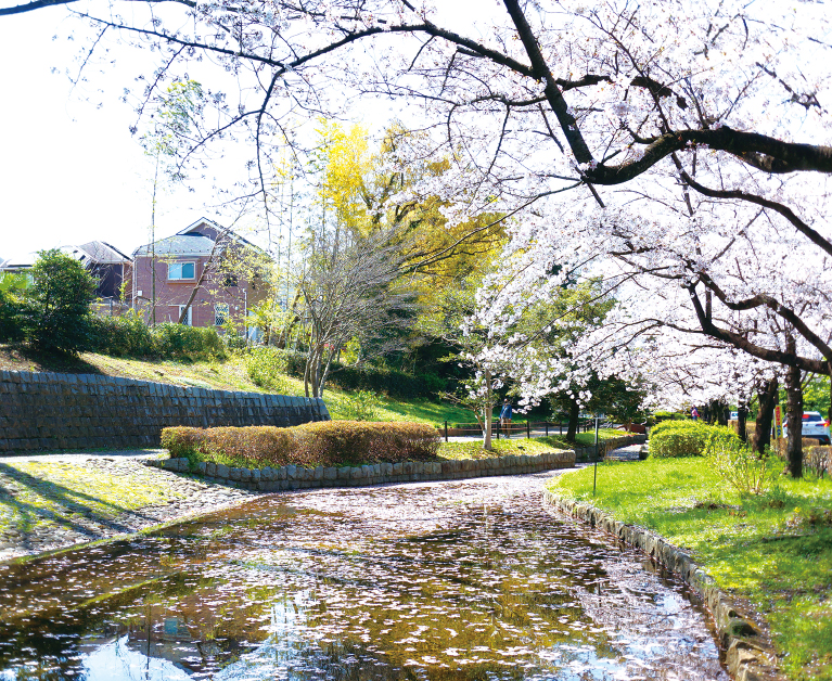 水と緑が調和した市民の憩いの場として親しまれています。園内には清らかなせせらぎが流れ、徒渉池では水遊びも楽しめます。暑い時期には子どもたちに人気のスポットです。