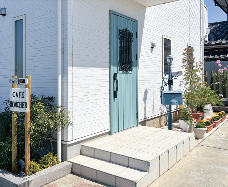 白と水色を基調としたリゾート感漂う一軒家カフェ。多彩なドリンクメニューにスイーツ、パスタやオムライス、オープンサンドなどの軽食も楽しめます。