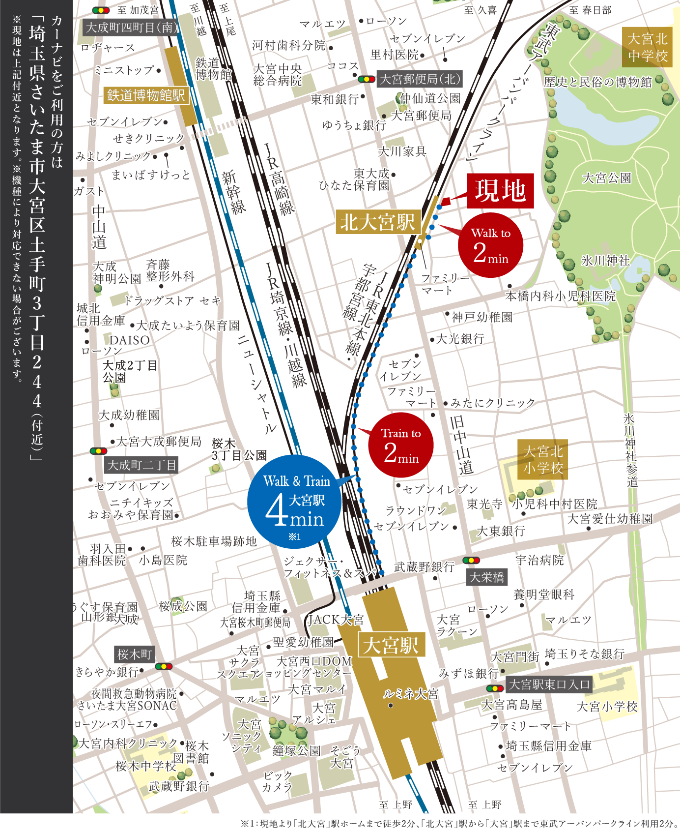 ※現地より「北大宮」駅ホームまで徒歩2分、「北大宮」駅から「大宮」駅まで東武アーバンパークライン利用2分。