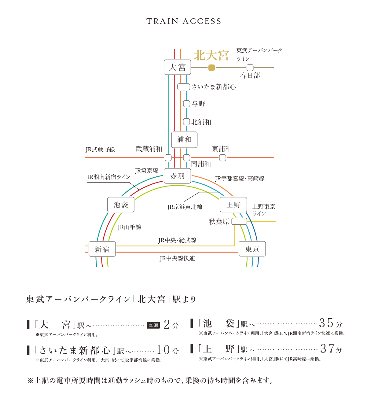アクセス ●北大宮駅より大宮駅まで【ラッシュ時: 2分 東武アーバンパークライン(大宮行)。利用。】【平常時: 2分 東武アーバンパークライン(大宮行)。利用。】