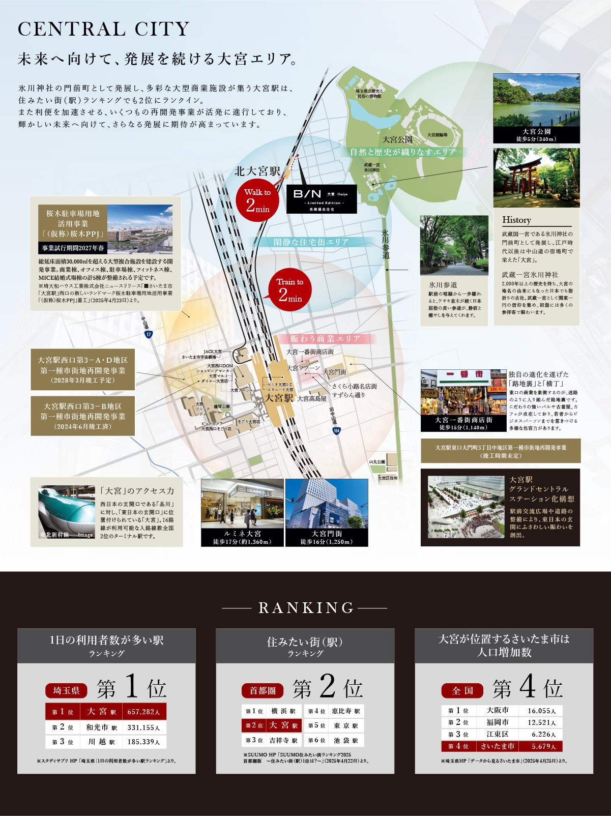 「北大宮」駅からわずか3分で到着する大宮駅 。駅を降りてから、周辺の多彩な大型商業施設やオフィスエリアへ、迷うことなくスムーズにアプローチできるようになります 。