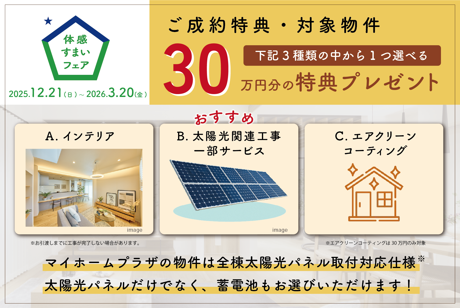 【2026年3月20日(金)まで】体感すまいフェア開催中!契約特典30万円分対象分譲地