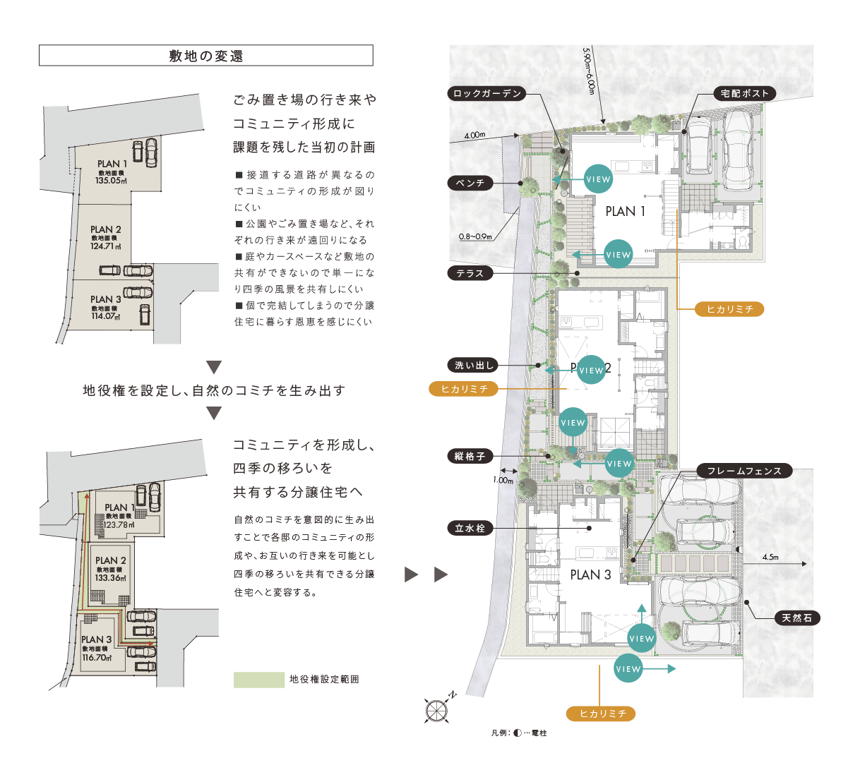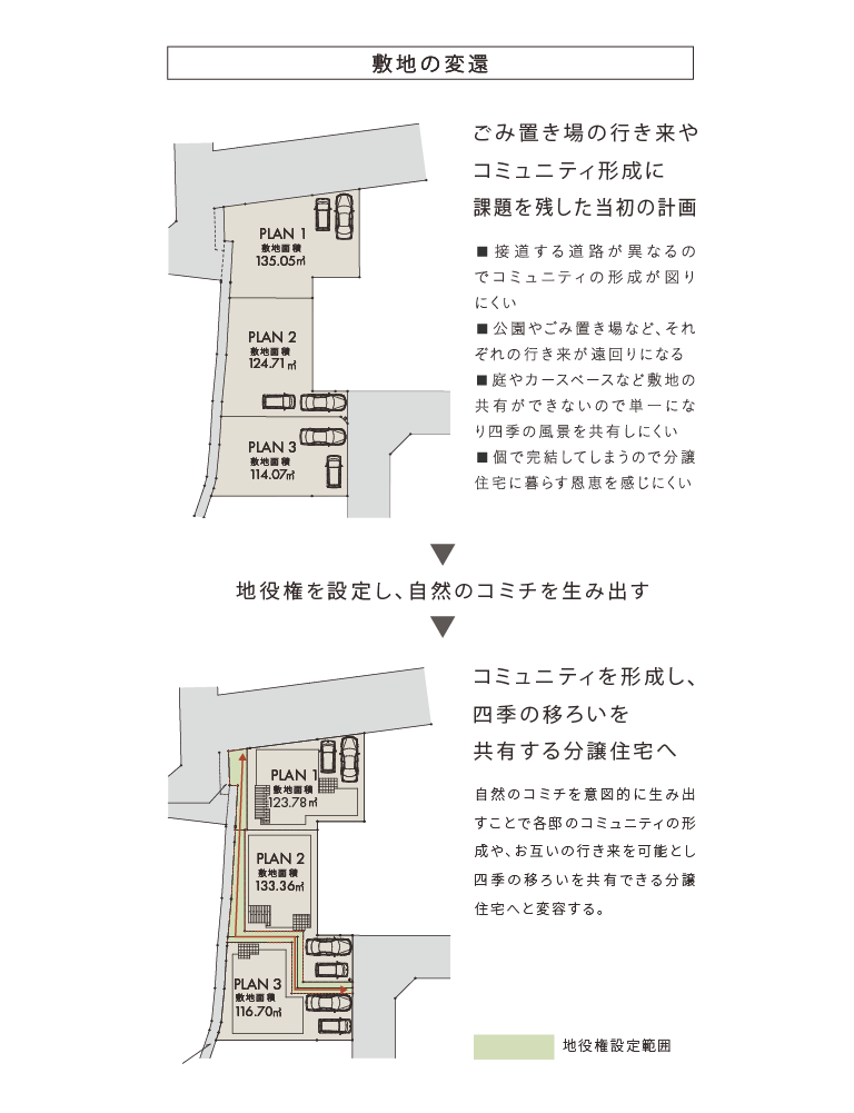 一般的な区割り計画に妥協せず、土地に内在する様々な可能性を再検討。 「自然のコミチ」を生み出すことで暮らしやすさを向上させ、住民同士の絆や四季の変化を感じられる配棟計画を実現しました。