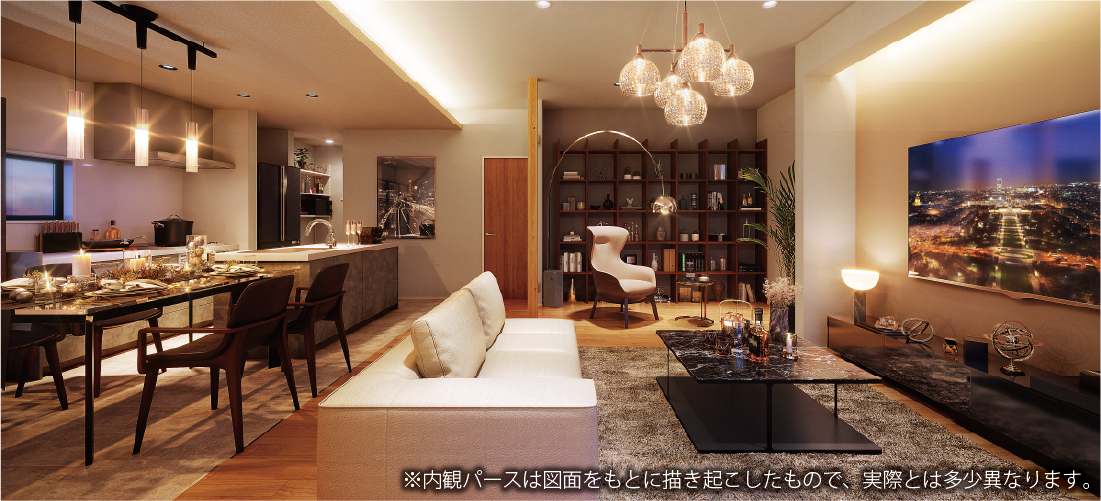 洗練された灯かりが彩る、ラグジュアリーな内装空間。