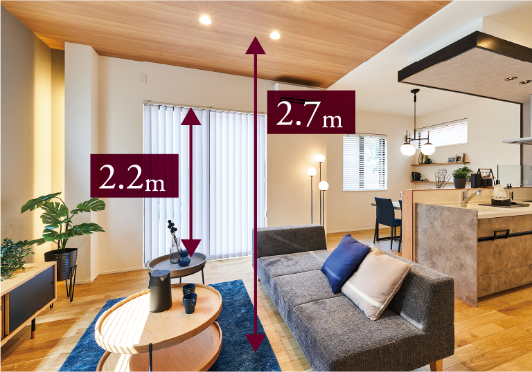 天井高2.7m、サッシ高2.2mで縦の空間の広がりを演出してくれます。