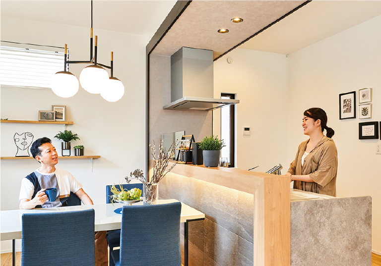 家事をしながらリビングにいる子どもとコミュニケーションが取りやすいキッチン。お料理中も家族との会話を愉しめます。