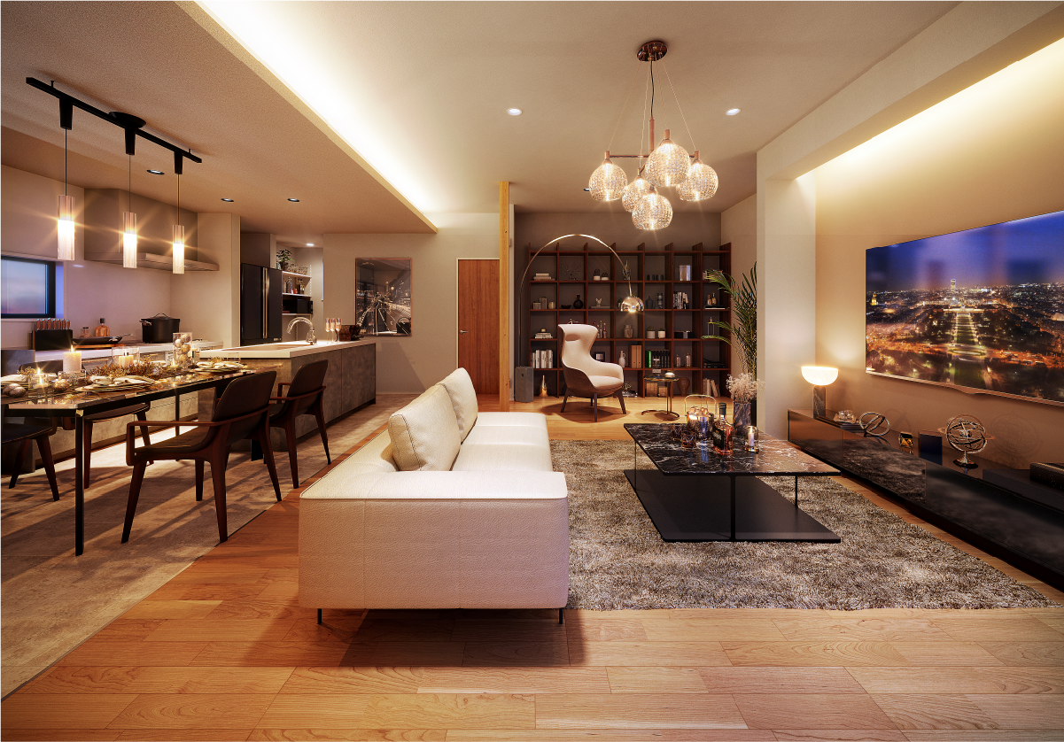 間接照明がやわらかく広がるリビング・ダイニングは、上質な寛ぎを演出する空間。