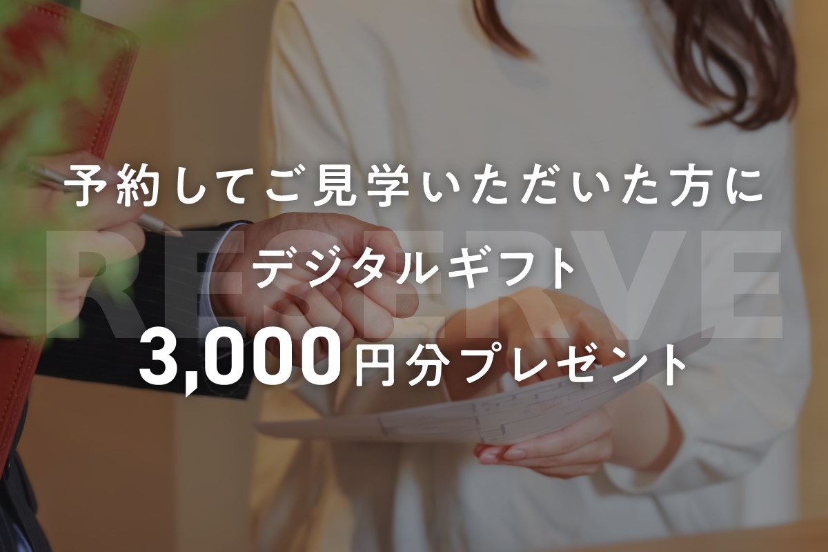 予約して現地ご見学いただくと、AmazonギフトカードまたはPayPay3,000円分プレゼントいたします。