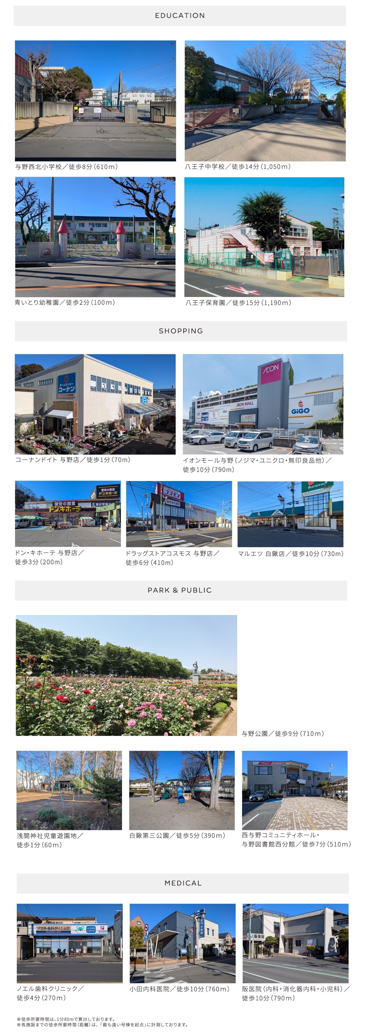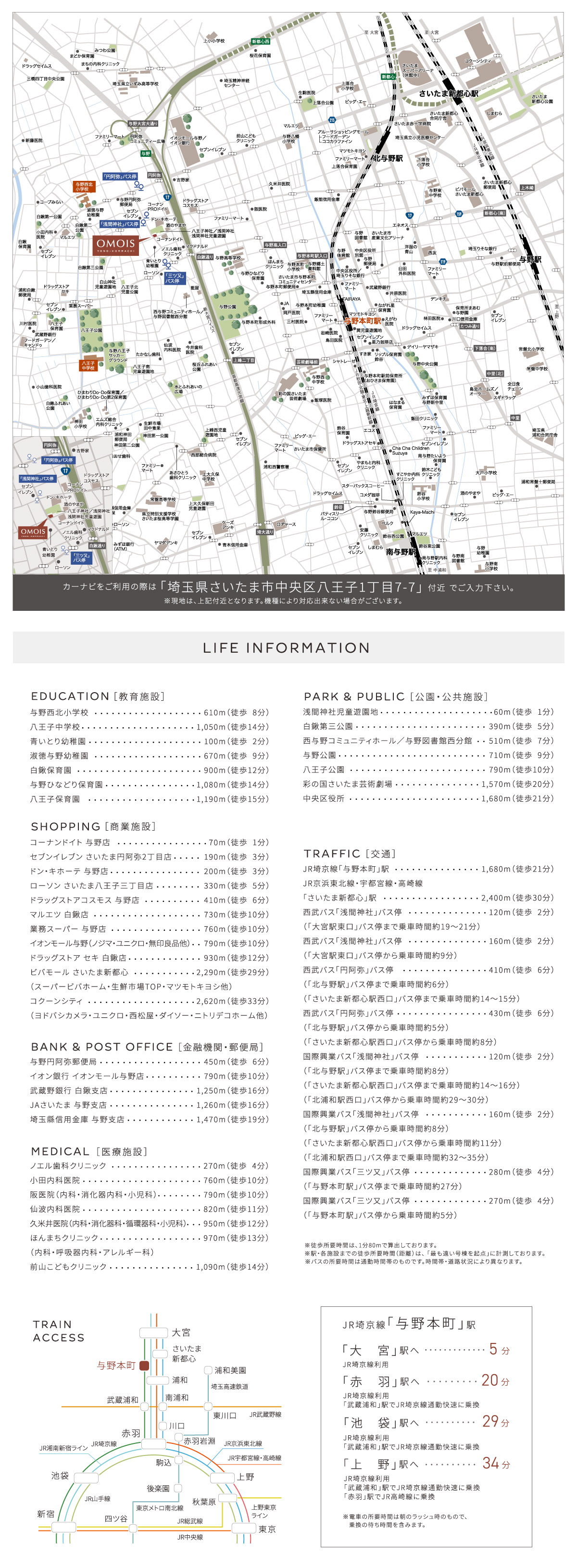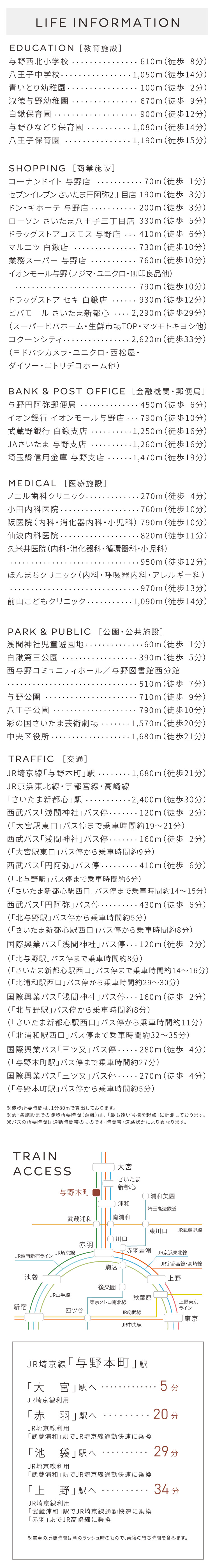 ■JR埼京線「与野本町」駅利用■「さいたま新都心」駅・「北与野」駅へバスや自転車でアクセス可能■比較的安定した地盤が広がる大宮台地の高台に位置■角地ならではの開放感と明るさの魅力があふれる街並み■立地の特性を住空間に活かした邸別設計■暮らし関連の施設が徒歩圏内に充実・与野西北小学校 徒歩8分・イオンモール与野 徒歩10分・セブンイレブンさいたま円阿弥2丁目店 徒歩3分