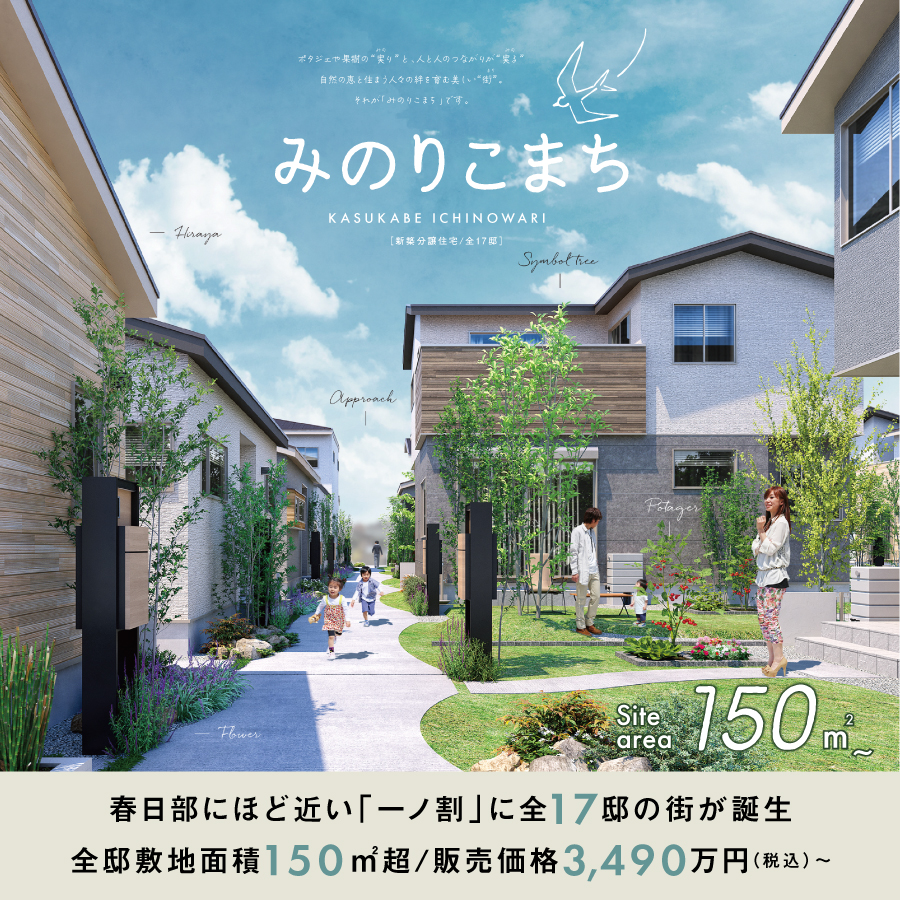【東武スカイツリーライン『一ノ割』駅・東武アーバンパークライン『藤の牛島』駅利用可能】庭のある全17邸のやさしい街づくり◆春日部にほど近い「一ノ割」に全17邸の街が誕生◆敷地面積150㎡超のゆとりが叶える2つの庭・アクティブガーデン・リビングガーデン◆庭のあ...