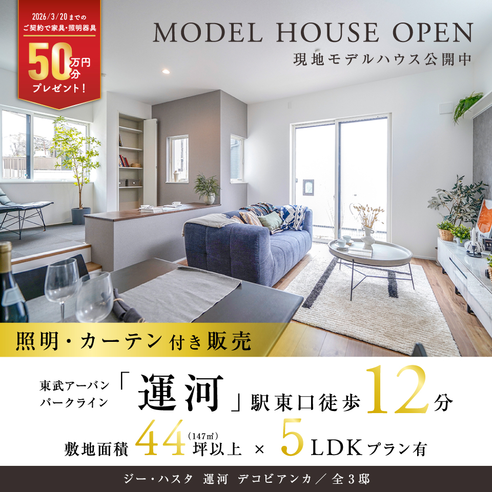 ★1.2F照明・カーテン付販売★現地モデルハウス完成■東武アーバンパークライン「運河」駅徒歩12分■★当駅始発/急行停車駅★■全邸...