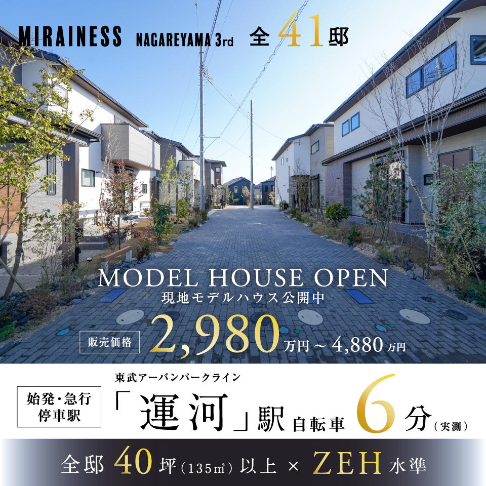 現地モデルハウス完成/見学予約受付中流山市に誕生する全41邸の「ミライネス流山 3rd」森と暮らす街・流山市から始まる41家族...