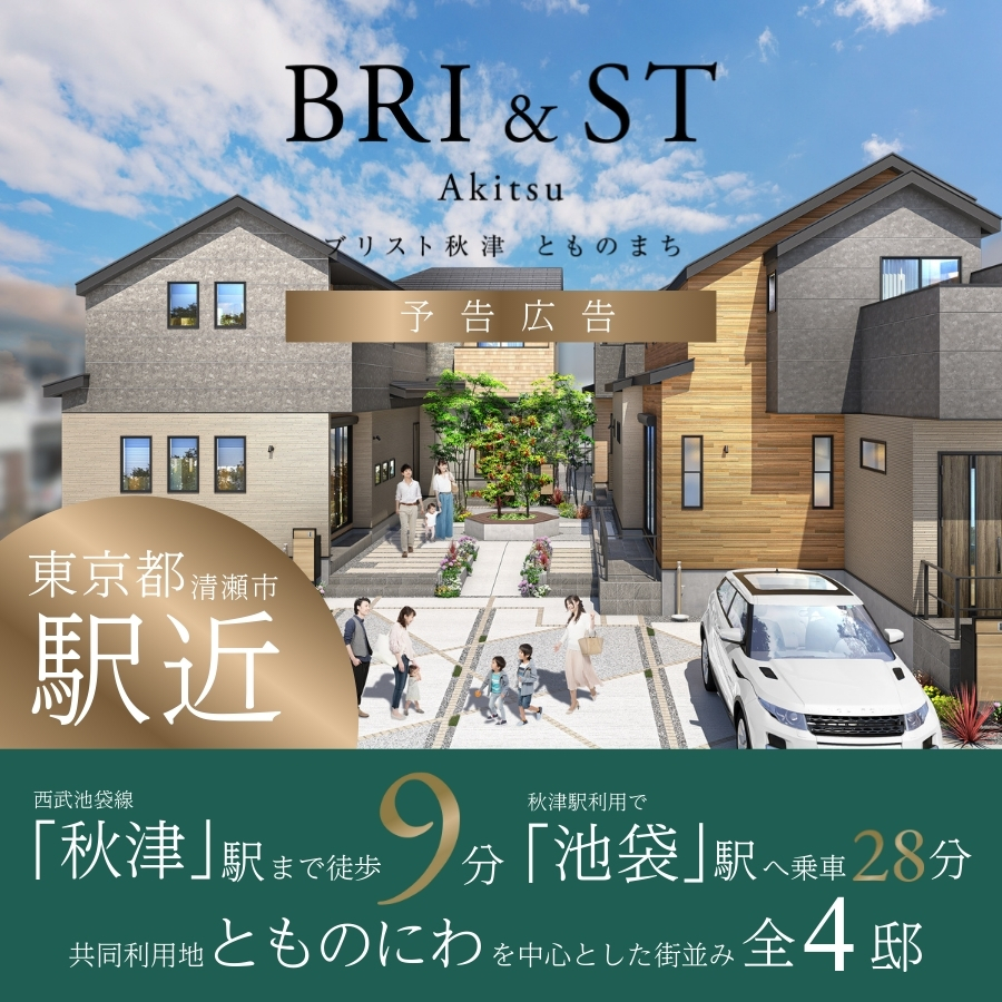 【予告広告】東京都清瀬市に誕生する駅近戸建て、全4邸◆西武池袋線「秋津」駅まで徒歩9分◆JR武蔵野線「新秋津」駅まで徒歩13~14分◆秋津駅利用で「池袋」駅まで乗車28分~ 共同利用地「とものにわ」を中心とした街並み全4邸 ~◆カースペース2台号棟あり◆5LDK対応号棟...
