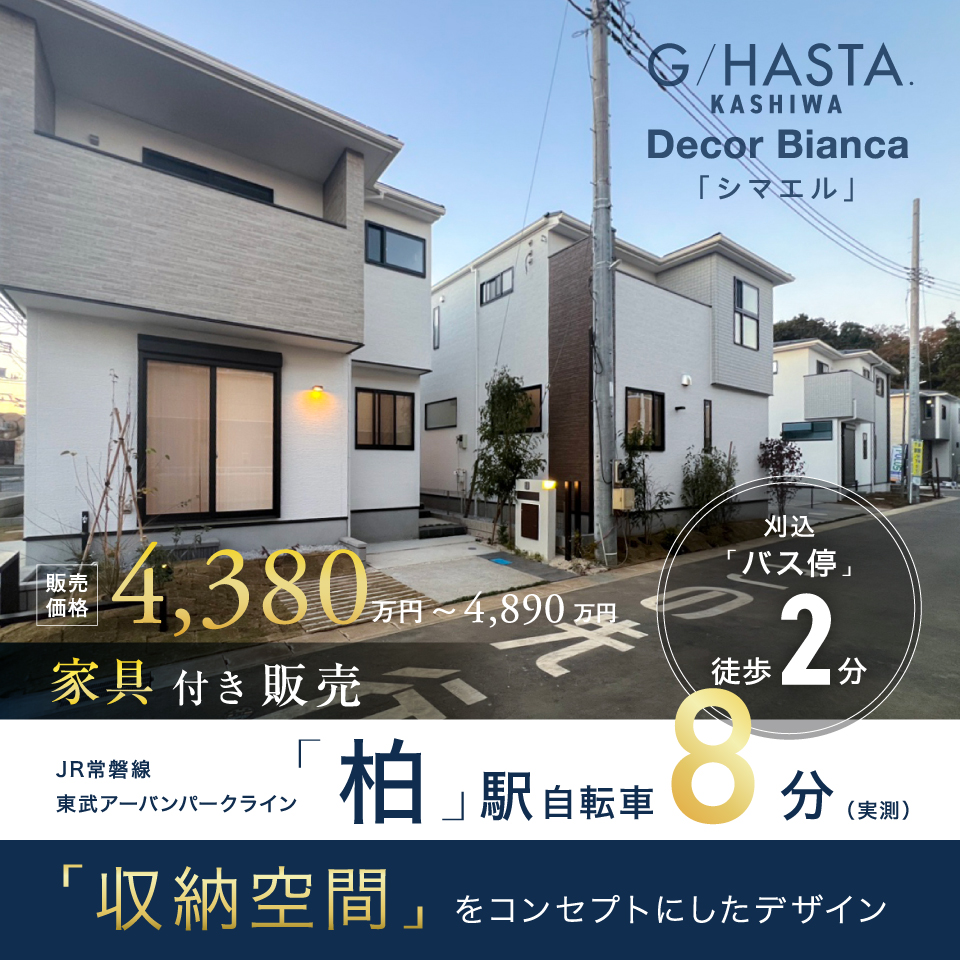 【2期予告広告】【1期モデル号棟/家具付き販売中】(1期)販売価格:3990万円〜5590万円のビックタウン■東武アーバンパークラインとJR常磐線の2路線3駅利用可能■「柏」駅徒歩26~28分、「新柏」駅徒歩18~19分、「南柏」駅徒歩21~23分■全邸敷地面積100m2以上×全37邸■公...
