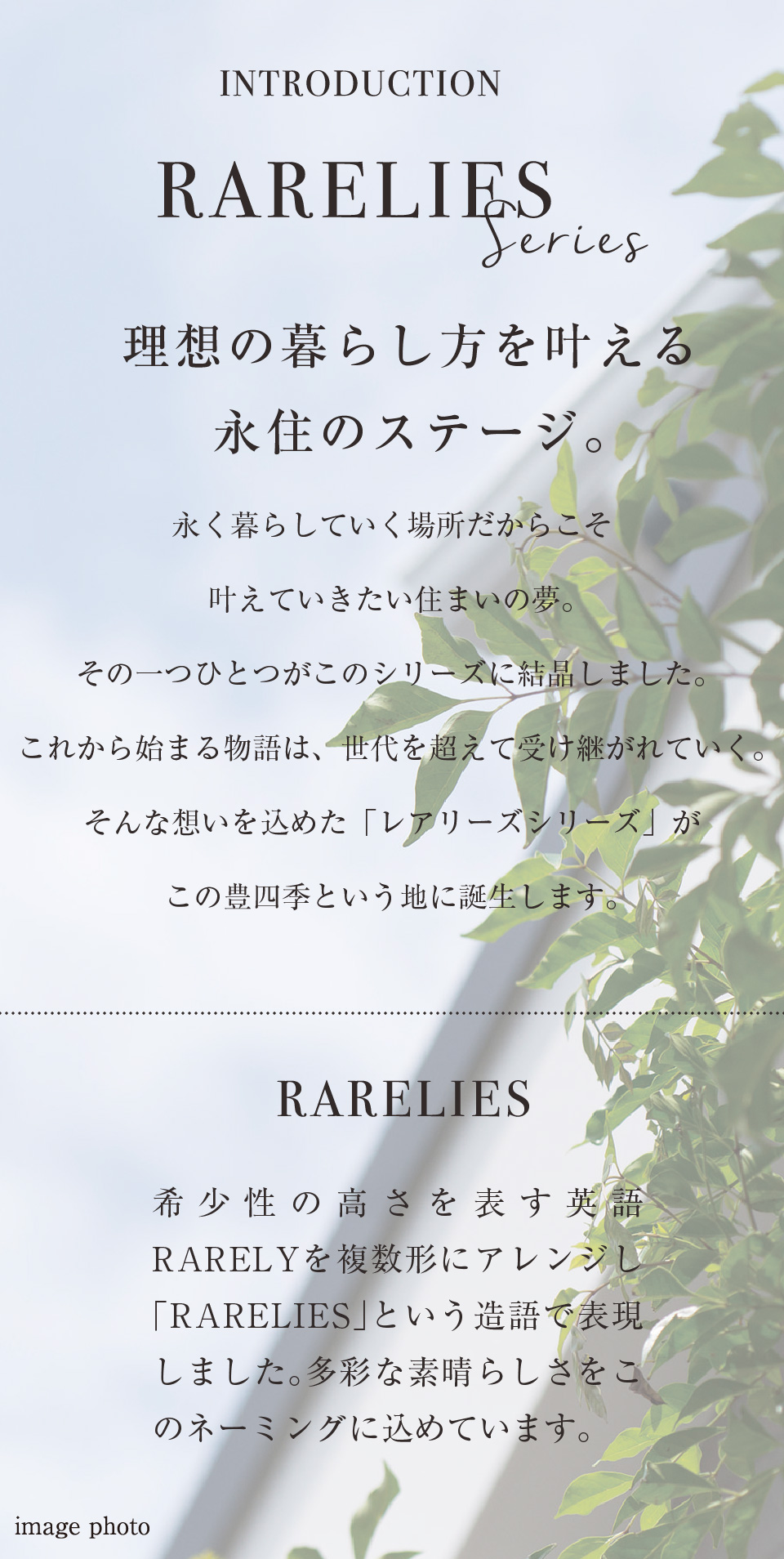 永く暮らしていく場所だからこそ叶えていきたい住まいの夢。その一つひとつがこのシリーズに結晶しました。これから始まる物語は、世代を超えて受け継がれていく。そんな想いを込めた「レアリーズシリーズ」がこの豊四季という地に誕生します。