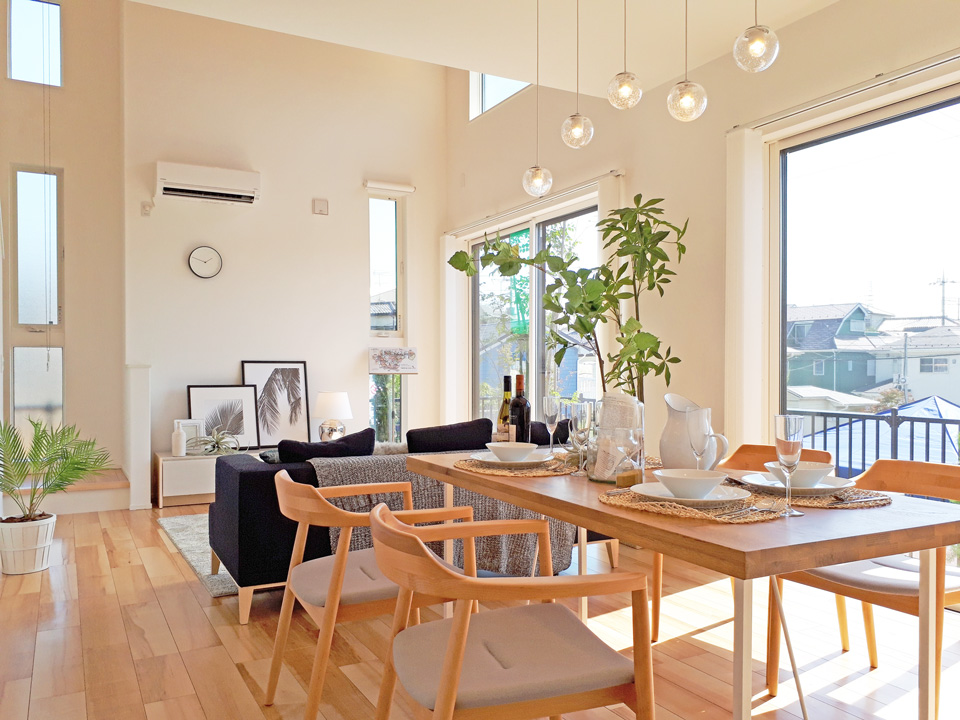 勾配天井を採用した開放的なリビングの23号棟。