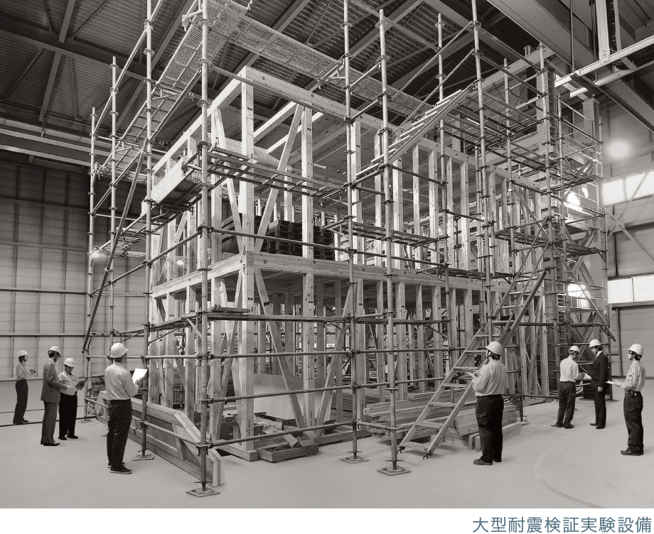 施工の善し悪しが、どのように性能に影響するのかを実験により確認し、施工にフィードバック。「強く」と「広く」を両立するための技術と実大建物の性能を検証できる、民間でも数少ない大型耐震検証実験設備を保有しています。