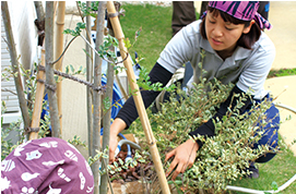 また、近隣の方同士で気軽にコミュニケーションがとれる広場でもあります。フットパス沿いに植えられた木々や花々は四季の彩りを装い、身近な自然とふれあいを育てる街の中心ともなります。