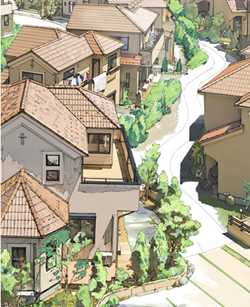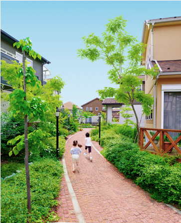 分譲地内の木々が、昔からある自然、川、森、公園などの周辺地域へと広がっていくことにより、街全体に緑があふれ、この街を愛する人が増えていきます。