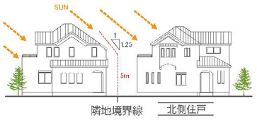 隣接する住戸の陽当りに配慮し、北側の隣地境界線と建物の距離、屋根の高さなどに綿密な制限があります。