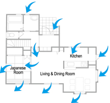 しっかりと風の流れや陽光の照射を計算することで、家の向きや屋根の形状、窓の位置などの工夫で、家の中に風や陽光を採りいれ、電気を使わずに快適な生活を送ることができます。