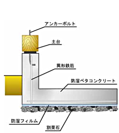 基礎部分には割栗石(石材を砕いたもの)を敷き詰め転圧機で充分に固めた上に、ソイルカバー(防湿シート)を敷きこみ、その上に厚さ170㎜のコンクリート+鉄筋を200㎜の網目に組んだベタ基礎を全棟に採用しています。これにより地盤改良施工と一体となった極めて頑丈な基礎となっています。さらに立ち上がり部のコンクリートの厚さは150㎜とし、コーナーハンチを設けて地震の際にかかる縦・横・斜めからの力を面で受け止めます。